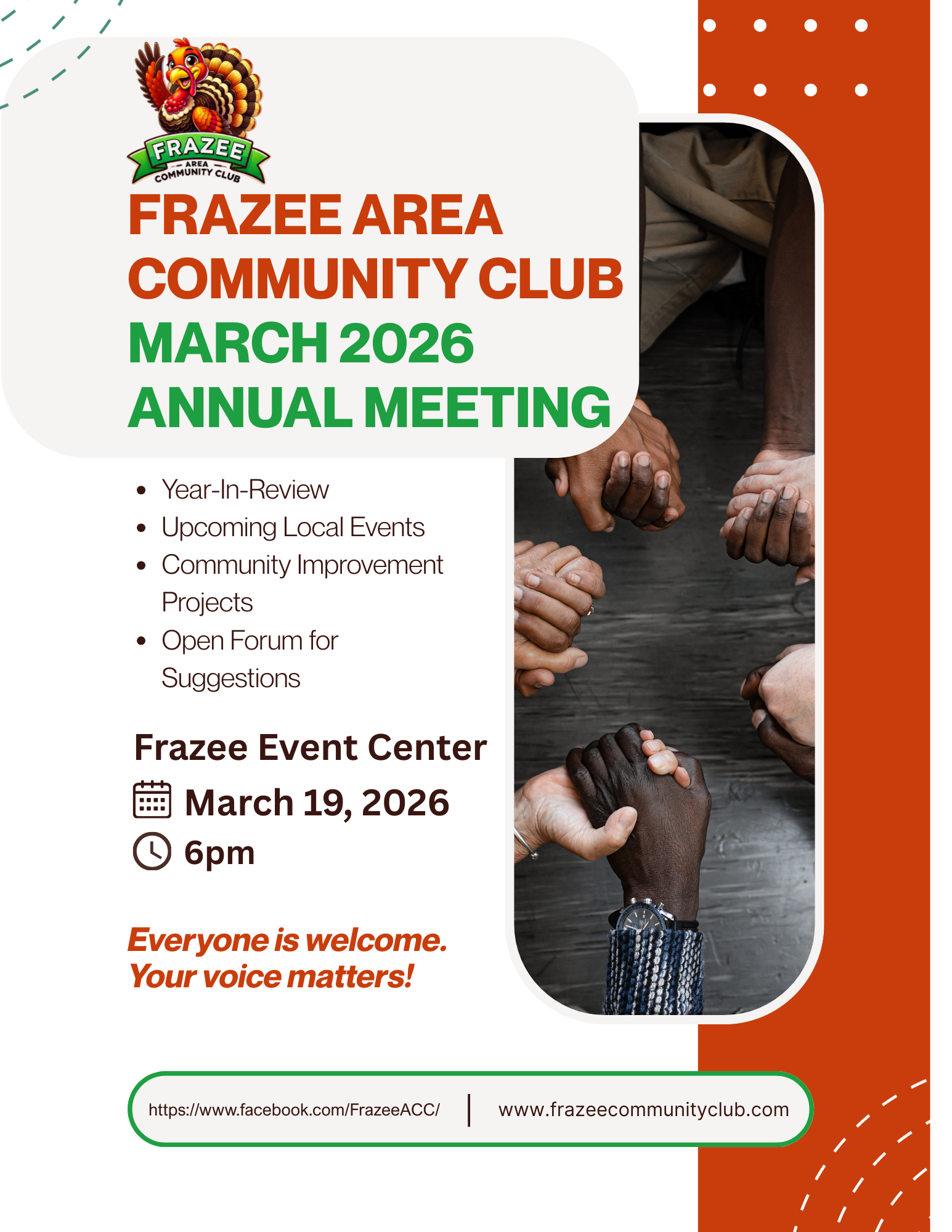 Stay informed on local and community functions happening in Frazee, MN! Whether your business wants to volunteer for a local event or your family wants to stay involved in the community, the Frazee Community Club helps provide fun family affairs all year long! From our famous Turkey Days to holiday celebrations, join our club today to stay on top of the latest fun-filled events and support our community! Sign up today here to get started!