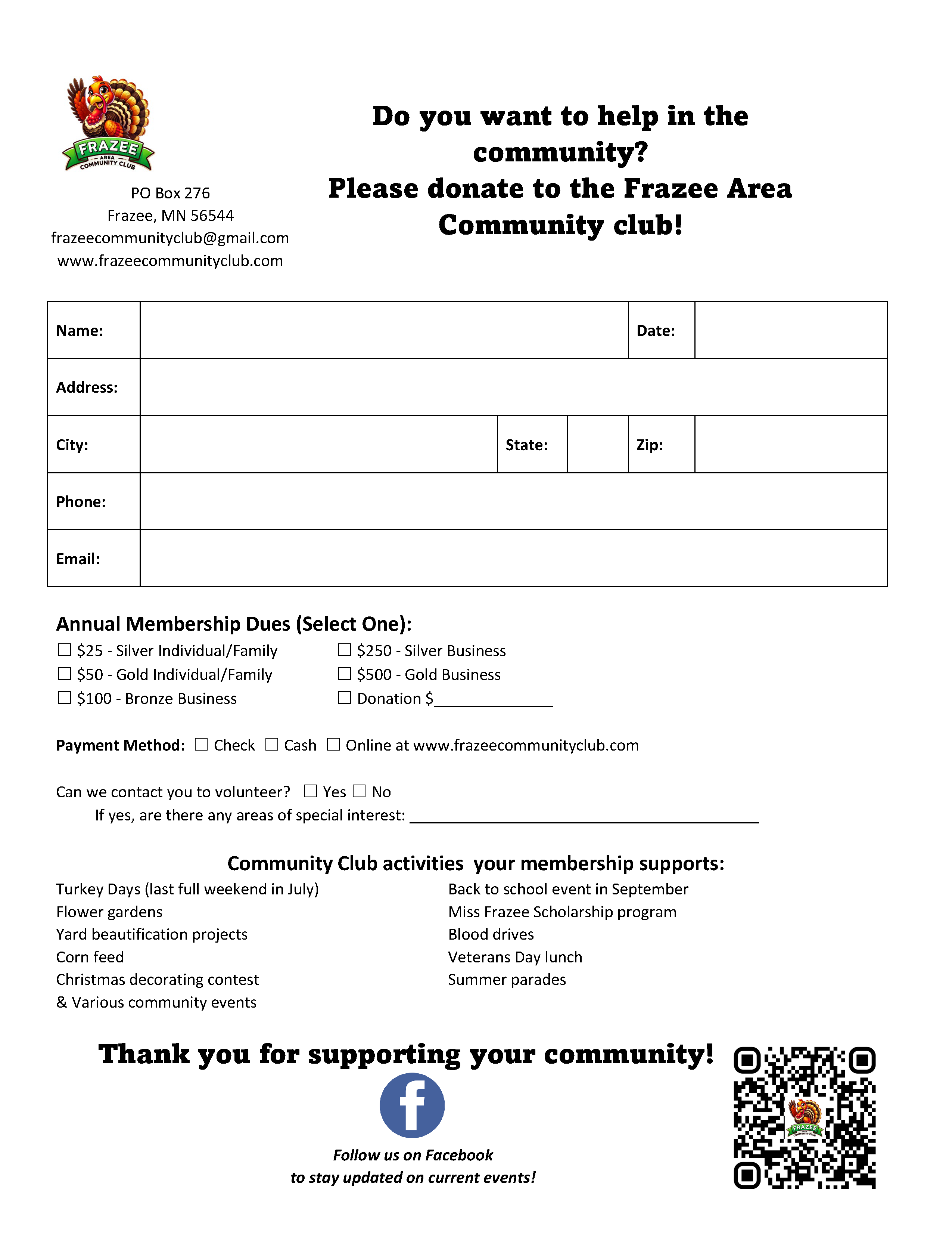 Help make Frazee, MN a better place! Sign up to join our community club today!